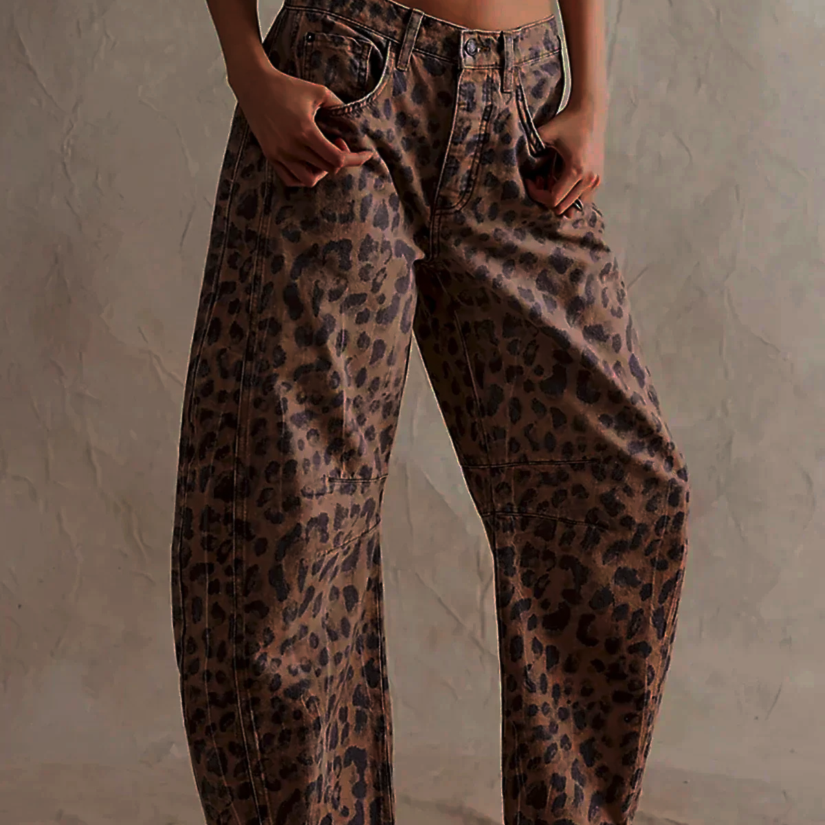 Leopard Print Wide Leg Denim Jeans with Relaxed Fit