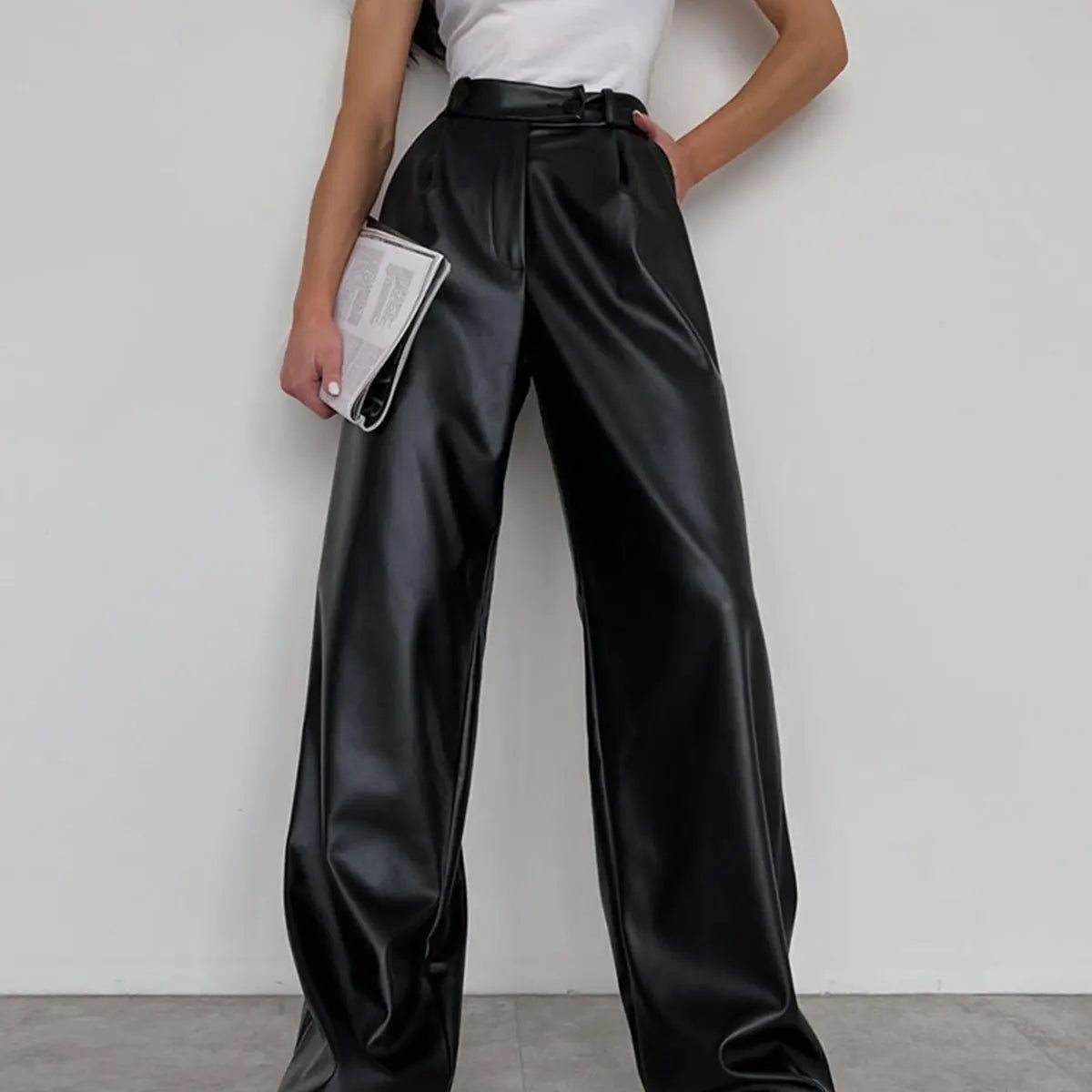 High Waist Wide Leg Faux Leather Pants with Belt
