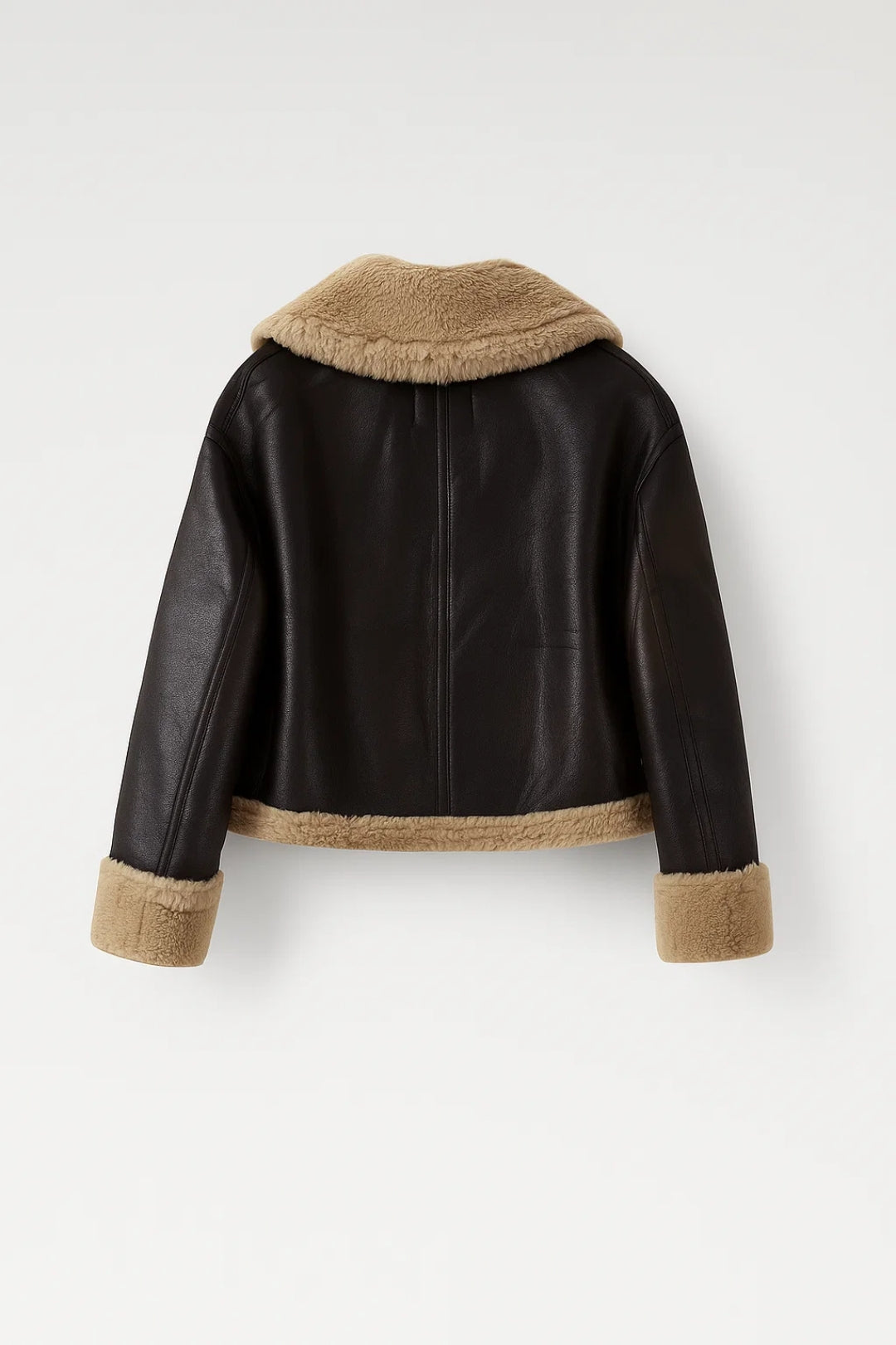 • Faux leather exterior with soft shearling trim